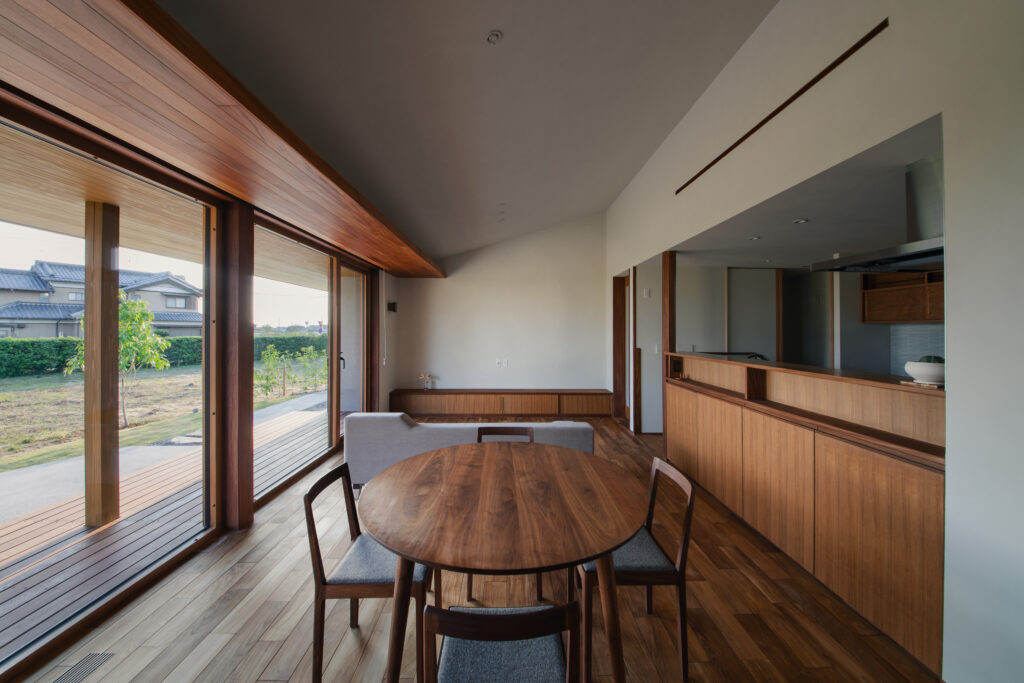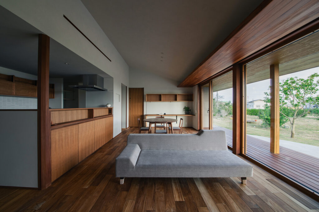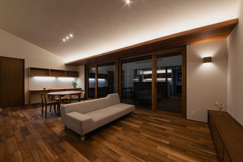 リビングの大開口木製建具が内と外を心地よくつなぎ、造作家具が空間に統一感と落ち着きを添える、上質な暮らしを叶えました。