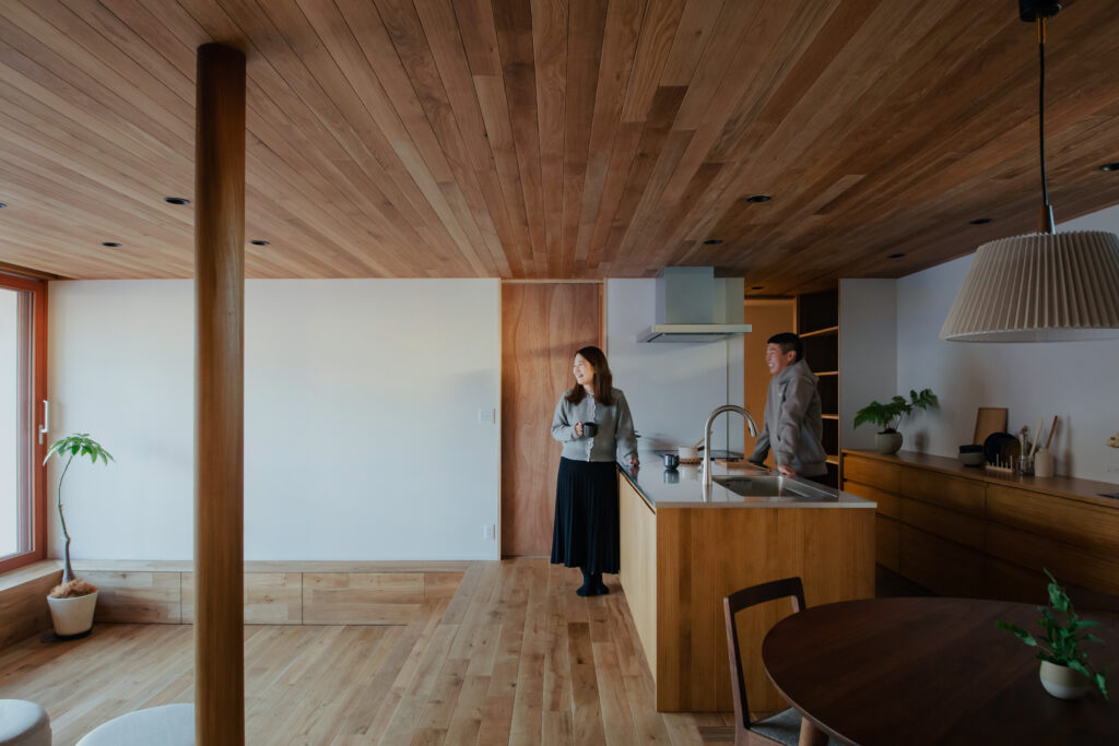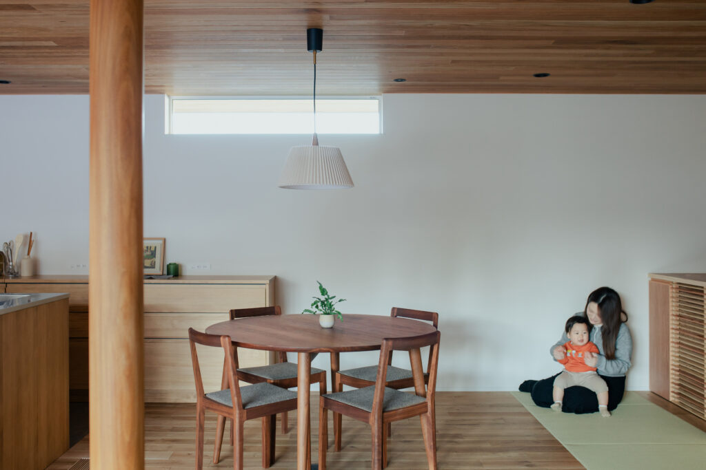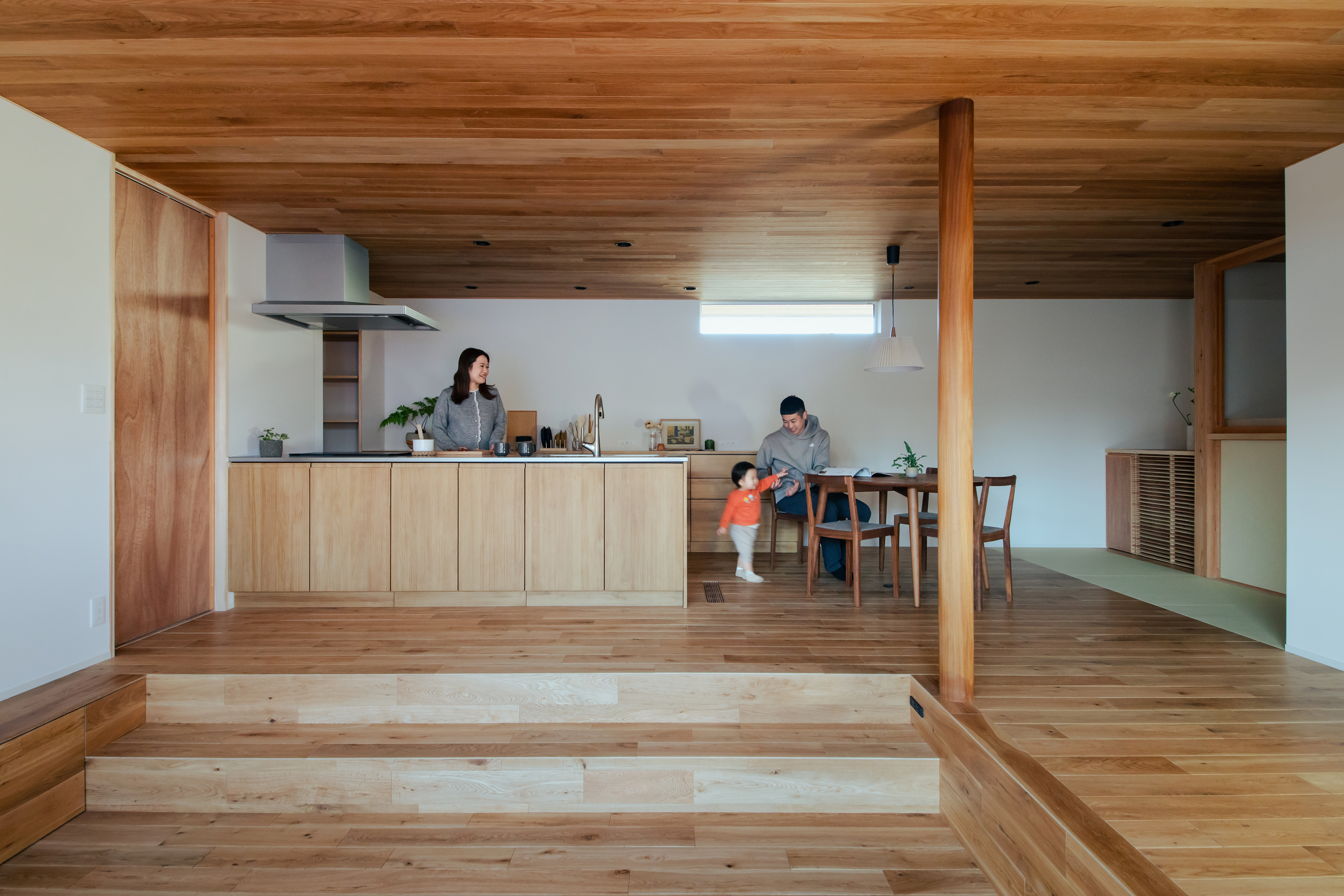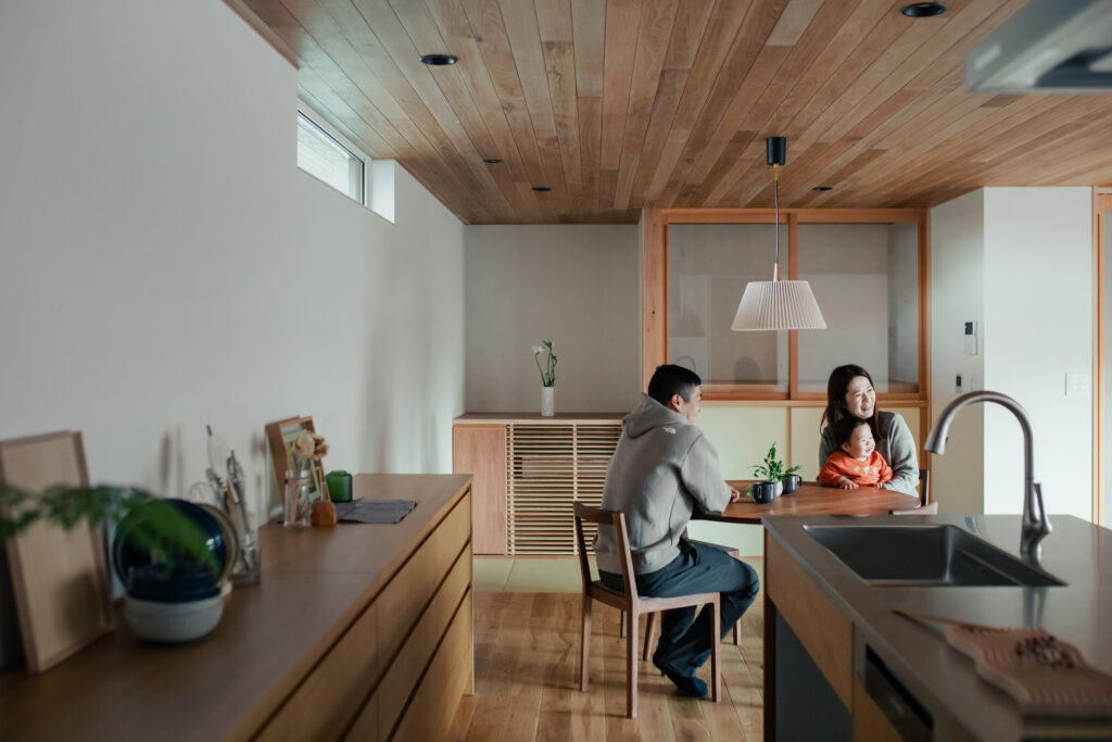 木のぬくもりを感じるキッチンや、ちょっとした家事や育児に役立つ畳スペース、ぐるりと回れる回遊動線など、暮らしやすさにも配慮。