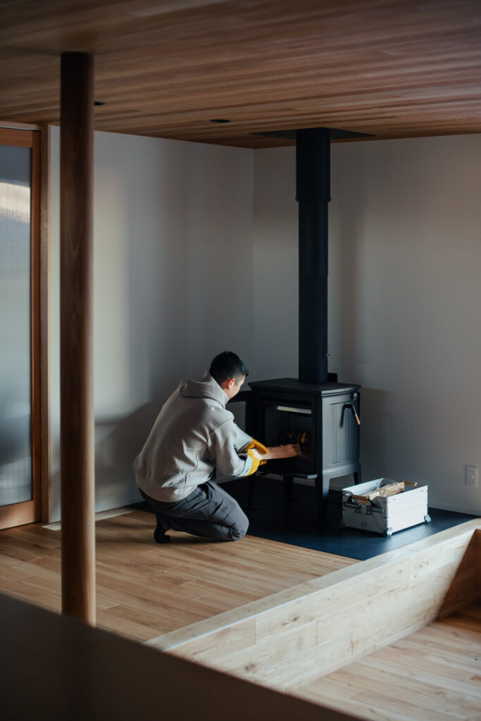 薪ストーブの炎がやさしく揺れる、木のぬくもりに包まれた住まい。